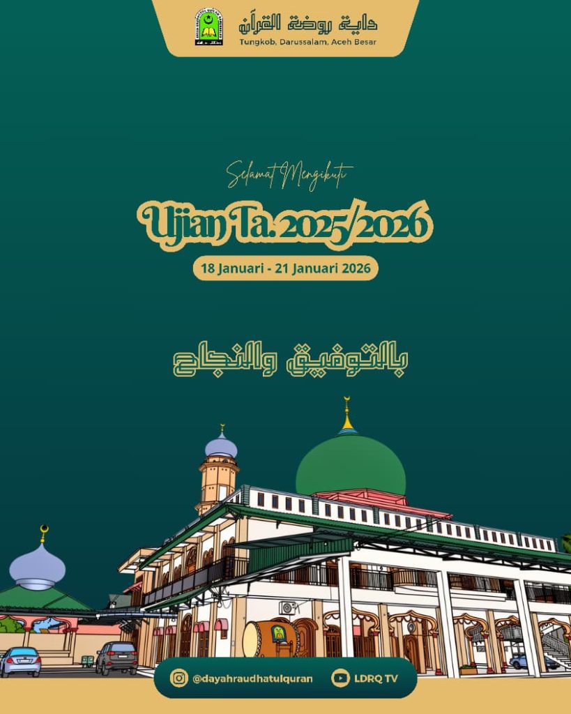 Tungkop, Darussalam – Dayah Raudhatul Qur’an (DRQ) kembali melaksanakan agenda akademik rutin berupa Ujian Semester Tahun Ajaran 2025/2026. Kegiatan ini merupakan bagian penting dari sistem…