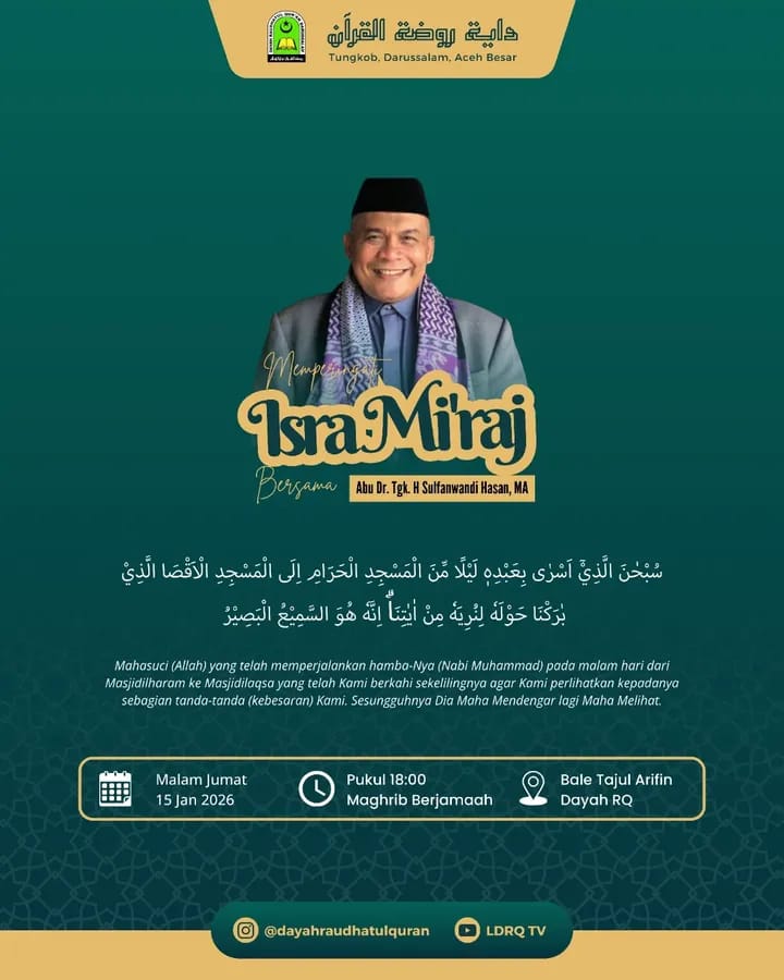 Dalam rangka memperingati malam Isra Mi’raj Nabi Muhammad ﷺ, Dayah Raudhatul Qur’an menyelenggarakan kegiatan zikir bersama yang berlangsung dengan penuh kekhusyukan dan makna spiritual pada malam Jumat, 27 Rajab 1447 Hijriah, bertempat di Dayah Raudhatul Qur’an, Tungkob Darussalam. Kegiatan ini menjadi salah satu agenda keagamaan rutin yang bertujuan untuk menghidupkan malam-malam istimewa dalam kalender Islam serta memperkuat ikatan ruhani antara hamba dengan Allah SWT. Acara diawali dengan salat Maghrib berjemaah, yang diikuti oleh ribuan jamaah. Seusai shalat, jamaah larut dalam lantunan zikir dan doa yang dipanjatkan secara berjemaah, menciptakan suasana tenang, khidmat, dan penuh harap akan rahmat serta ampunan Allah SWT. Zikir bersama ini menjadi momentum muhasabah diri, mengingat kembali perjalanan hidup, serta memperbarui niat untuk meningkatkan kualitas ibadah. Puncak acara diisi dengan tausiah agama yang disampaikan oleh Abu Dr. Tgk. H. Sulfanwandi, MA. Dalam ceramahnya, beliau menjelaskan bahwa peristiwa Isra Mi’raj bukan sekadar perjalanan fisik Rasulullah ﷺ, melainkan sebuah peristiwa agung tentang perjumpaan seorang hamba dengan Allah SWT. Menurut beliau, Isra Mi’raj adalah simbol kedekatan spiritual tertinggi antara manusia dan Rabb-nya, yang menjadi sumber kekuatan iman dan keteguhan ibadah. Dalam tausiahnya, beliau menyampaikan bahwa malam 27 Rajab merupakan malam yang penuh nikmat dan karunia. “Alhamdulillah, Allah memberi kita nikmat yang paling agung, yaitu diizinkan bergabung menyebut-nyebut Allah secara berjemaah. 27 Rajab adalah peristiwa Isra Mi’raj, peristiwa jumpa dengan Allah, dan itu adalah nikmat yang paling indah dalam hidup,” tuturnya di hadapan jamaah. Ia menegaskan bahwa perjumpaan dengan Allah merupakan kebahagiaan yang melampaui segala kenikmatan dunia, bahkan menjadi gambaran tertinggi dari nikmat surga. Lebih lanjut, Abu Dr. H. Sulfanwandi, MA mengingatkan sabda Rasulullah ﷺ tentang majelis zikir sebagai taman-taman surga di dunia. Beliau mengajak seluruh jamaah untuk tidak menyia-nyiakan kesempatan berada dalam majelis zikir, karena di dalamnya terdapat rahmat, ketenangan, dan ampunan Allah SWT. Dalam majelis seperti inilah, lanjut beliau, hati yang lalai dibersihkan, dosa-dosa dihapuskan, dan jiwa kembali dikuatkan untuk menghadapi kehidupan. Dalam ceramahnya, beliau juga mengaitkan makna Isra Mi’raj dengan persiapan menyambut bulan-bulan mulia berikutnya, yakni Syaban dan Ramadhan. Malam Isra Mi’raj disebut sebagai bagian dari proses “pemanasan ruhani” sebelum memasuki puncak ibadah di bulan Ramadhan. Ia menekankan pentingnya membiasakan ibadah malam, memperbanyak zikir, doa, dan salat sunnah, sebagai bekal untuk meraih keutamaan Lailatul Qadar di bulan suci Ramadhan. Selain itu, jamaah diajak untuk merenungi hakikat kehidupan, bahwa hidup pada dasarnya adalah perjalanan menuju kematian. Kesadaran ini, menurut beliau, seharusnya mendorong setiap Muslim untuk memperbanyak amal saleh, menjaga hubungan dengan orang tua dan keluarga, serta memperkuat keikhlasan dalam beribadah. Dengan zikir berjemaah, beliau berharap jamaah dapat kembali dengan hati yang bersih, dosa yang diampuni, serta semangat baru untuk memperbaiki diri. Kegiatan zikir bersama dalam rangka memperingati malam Isra Mi’raj ini ditutup dengan doa bersama, memohon ampunan, keberkahan hidup, keteguhan iman, serta kemudahan dalam menjalani ibadah di bulan-bulan mendatang. Seluruh rangkaian acara berlangsung tertib dan penuh kekhusyukan, mencerminkan semangat kebersamaan dalam menghidupkan syiar Islam di lingkungan Dayah Raudhatul Qur’an. Melalui kegiatan ini, LDRQ berharap peringatan malam Isra Mi’raj tidak hanya menjadi seremonial tahunan, tetapi benar-benar menjadi sarana memperkuat keimanan, menumbuhkan kecintaan kepada ibadah, serta mempererat ukhuwah Islamiyah di tengah masyarakat.