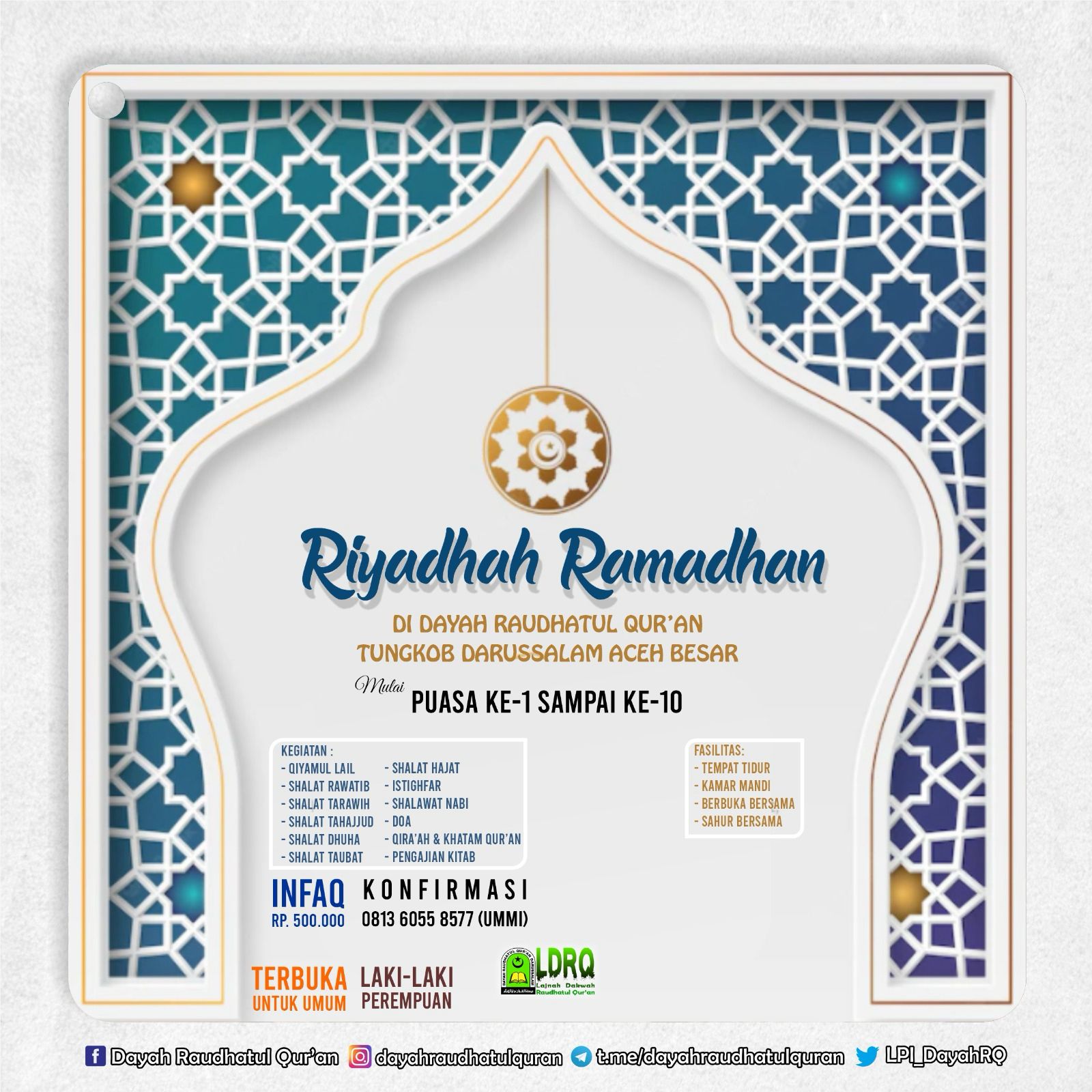 Dayah Raudhatul Qur’an Tungkop, Darussalam, Aceh Besar kembali mengadakan kegiatan Riyadhah Ramadhan sebagai bagian dari penguatan ibadah dan pembinaan spiritual umat Islam selama bulan suci Ramadhan. Kegiatan ini akan dilaksanakan mulai puasa ke-1 hingga puasa ke-10 Ramadhan dan terbuka untuk umum, baik laki-laki maupun perempuan.