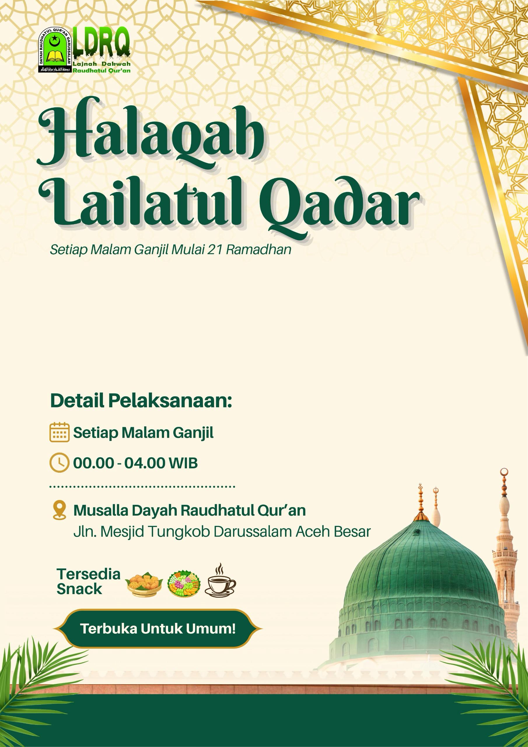 Dalam rangka menghidupkan malam-malam terakhir bulan suci Ramadhan serta meraih keutamaan tersebut, Lajnah Dakwah Raudhatul Qur’an (LDRQ) mengundang seluruh kaum muslimin dan muslimat untuk menghadiri kegiatan Halaqah Lailatul Qadar yang akan dilaksanakan di lingkungan Dayah Raudhatul Qur’an.